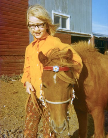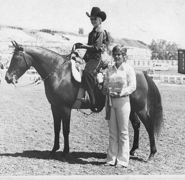 Brenda was either born with the "horse bug," or developed it young as her father led her around on ranch horses when she was a toddler. After surviving a trial by Shetland Pony, she graduated to a half-Arabian at age nine and started showing horses in the 1970s. In those times, "versatility" was prized in the Intermountain West, and a true horsewoman was expected to be competent in both English and Western riding styles.