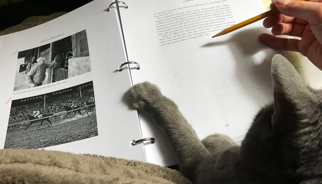In the photo, he was "helping" me edit the proofs of my first book, Montana Horse Racing: A History. Thank you, Sherlock. I think... (I overlooked some mistakes. That's probably my fault, and certainly my responsibility, but was I distracted? Hmmm...)